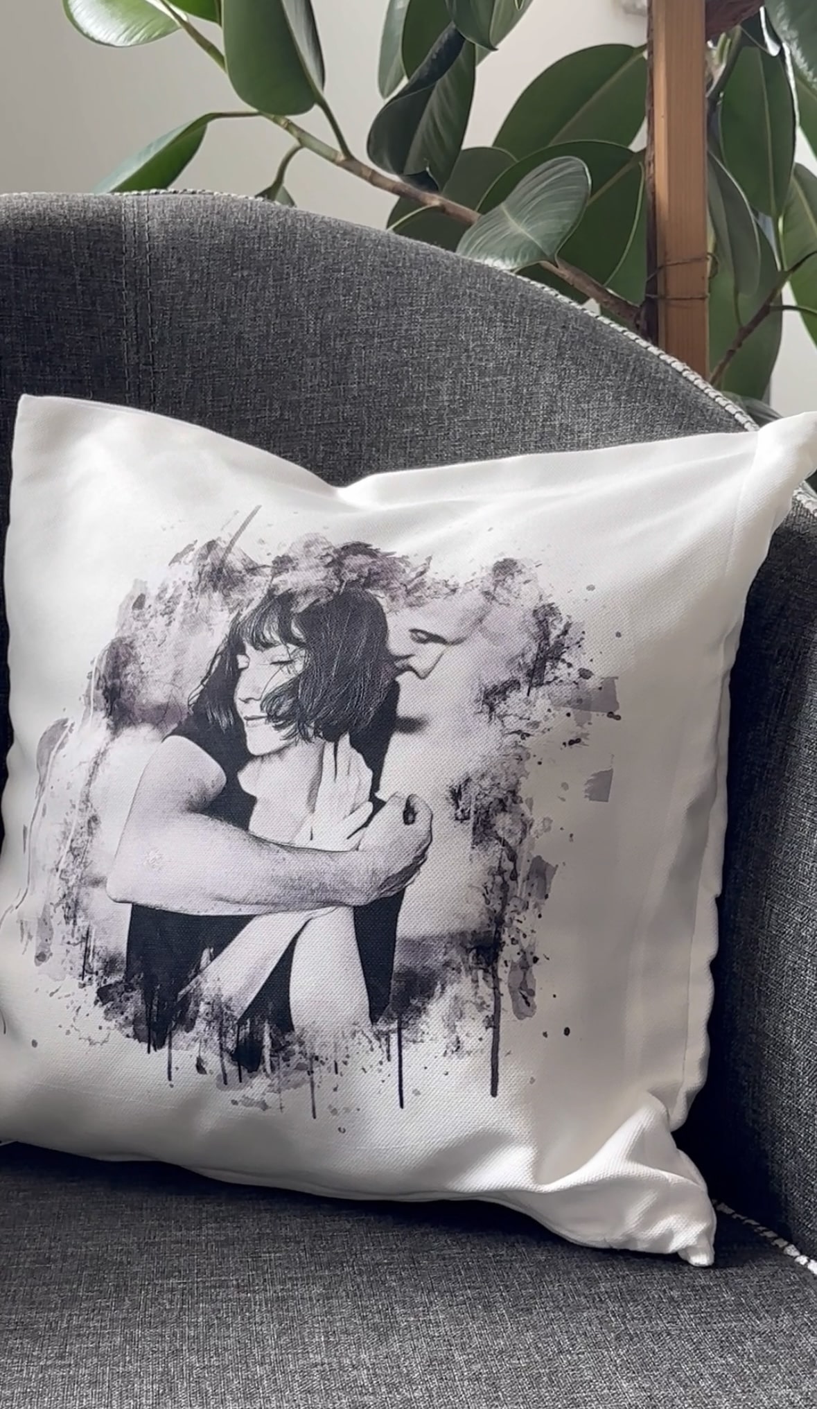 Imagine the joy on your loved one's face as they unwrap this thoughtful and unique present. It's not just a pillow; it's a keepsake that holds the memory of a special moment, frozen in time in a stylish and artistic manner. The charcoal sketch effect highlights the contours and features of the photo's subjects, providing an eye-catching contrast against the soft, white fabric of the pillow.