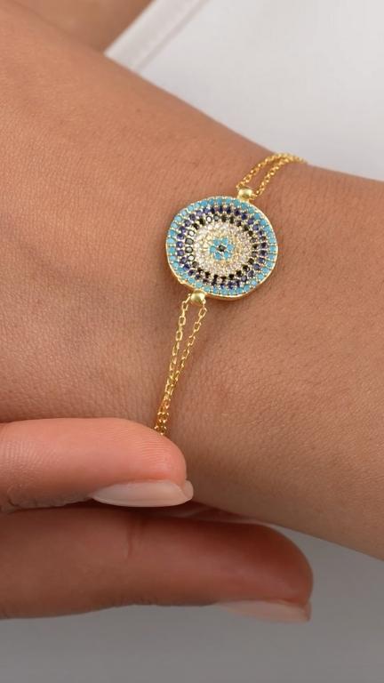 The evil eye symbol has been used for centuries across various cultures as a talisman to ward off negative energy and bring good luck. Our bracelet encapsulates this tradition with a modern twist, featuring a delicate gold-plated chain and a vibrant evil eye charm at its center. The charm is meticulously designed with an array of sparkling crystals and a captivating blue center, which is believed to reflect evil intentions away from the wearer.
