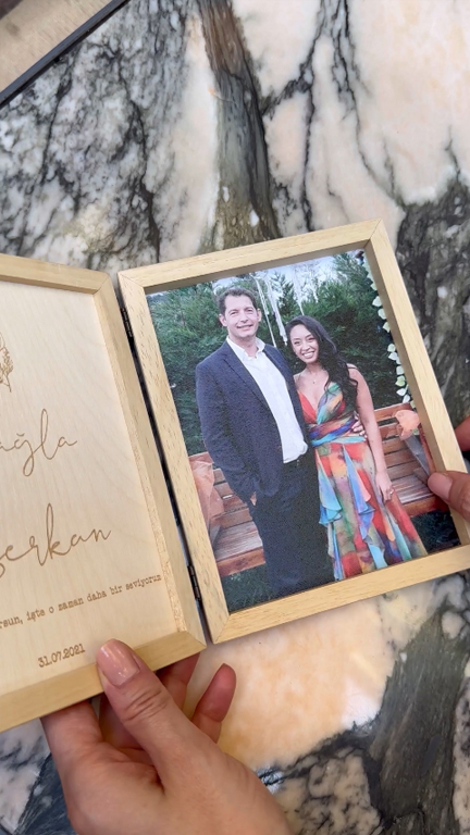 The frame's natural wood finish brings a warm and classic feel to any room, making it a versatile piece of decor that fits well in a living room, study, or bedroom. The hinged design offers a sense of intimacy and importance, as it encases the picture and message like a book of memories.