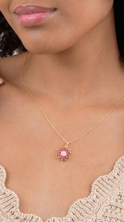 Introducing our stunning Pink Zirconia Flower Pendant Gold Necklace, a symbol of love and appreciation that is perfect for the special woman in your life. Whether you're shopping for your mom, partner, friend, or even treating yourself, this necklace is designed to impress and express your affection on any occasion, from anniversaries to birthdays, or simply as a spontaneous gesture of love.