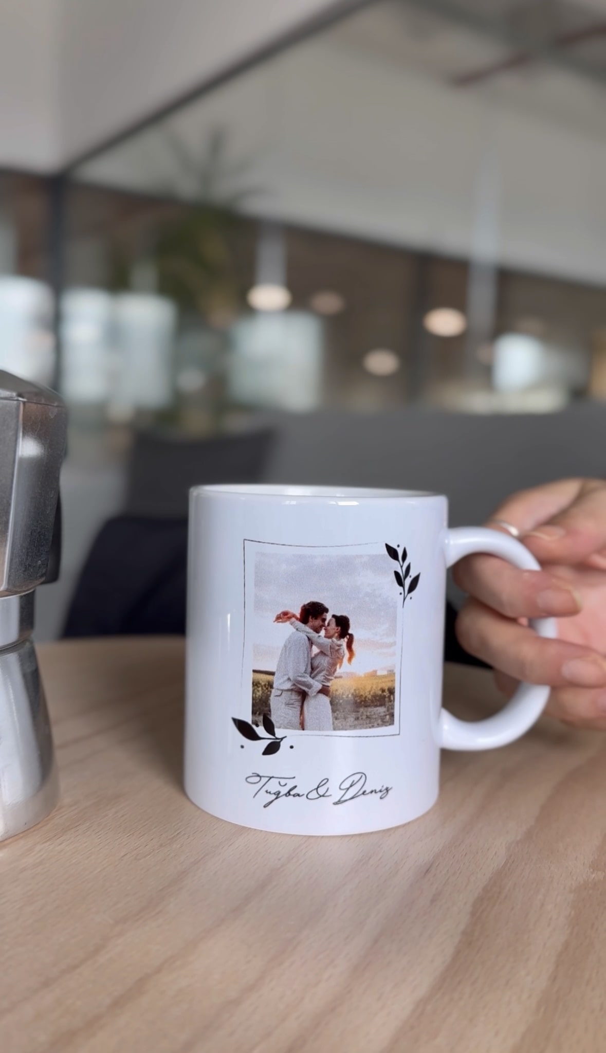 Each mug is made from high-quality porcelain, ensuring durability and a classic feel. The personalization process is simple: you provide a picture, and we print it onto the mug with precision and care. The image is accompanied by names or a message of your choice, creating a truly unique item that's both functional and sentimental.