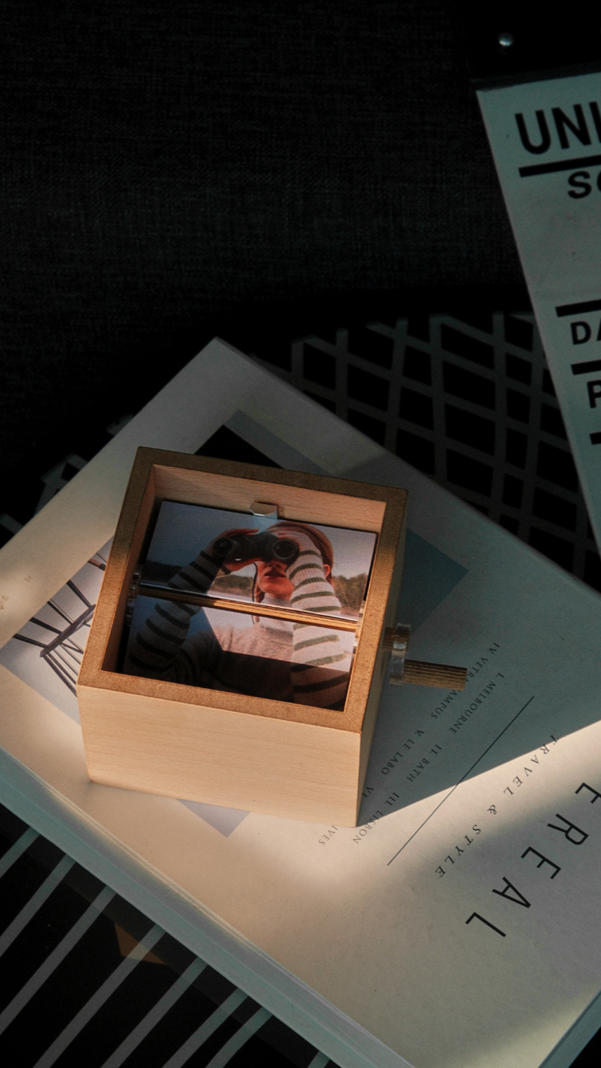 With a simple turn of the side handle, your eight personalized photos flip in sequence, creating a beautiful, cinematic motion that feels like watching your own tiny film. It’s nostalgic, artistic, and undeniably memorable.